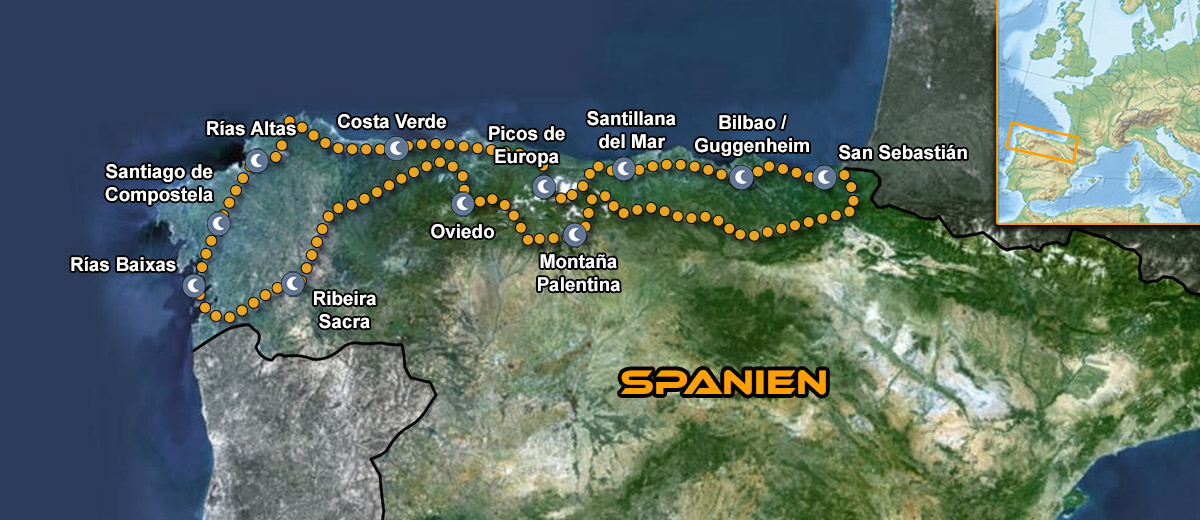 Der Norden Spaniens ist bekannt für seine grüne Hügellandschaft, die zerklüftete Küste und die Fülle an ausgezeichneten Meeresfrüchten. Während der Grünen Nord-Spanien Motorradreise erkunden wir die Regionen des Baskenland, Asturien, Kantabrien und Galizien und erleben eine perfekte Mischung aus atemberaubender Küstenlandschaft im Norden Spaniens und dem majestätischen “Picos de Europa” Gebirge.